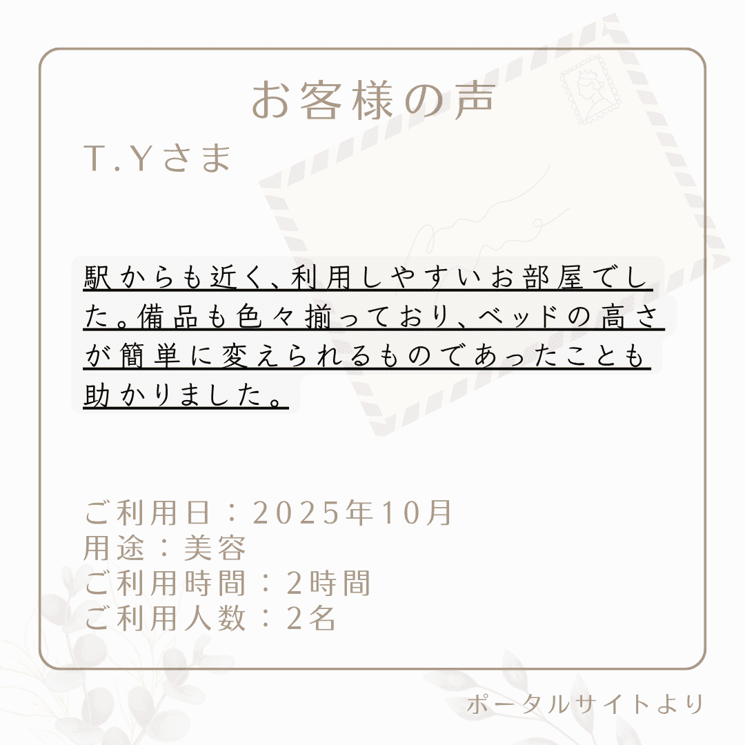 お知らせ 2025-05-13【お客様の声】お客様からいただいたコメントの一部をご紹介します こんにちは、レンタルサロンHarukaです。 本日は、日々レンタルサロンHarukaをご利用頂くお客様から頂いたお言葉の一部を