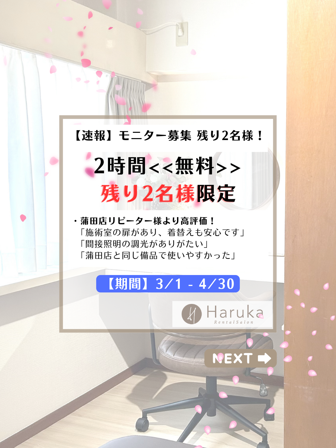 お知らせ 2026-03-03【大森店|ご利用者様モニター募集キャンペーン】のお知らせ こんにちは。 レンタルサロンHarukaです。 いつもご利用いただき、ありがとうございます。 レンタルサロンHaruka大森店のオー